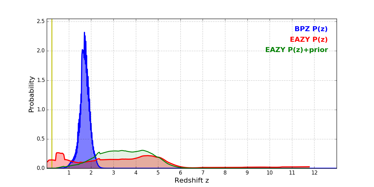 In P(z) plots: Yellow lines mark the cluster redshift z = 0.228,