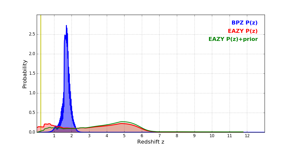 In P(z) plots: Yellow lines mark the cluster redshift z = 0.228,