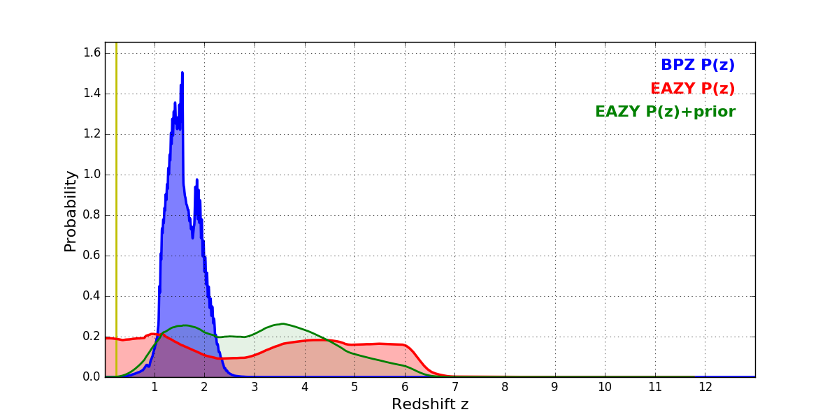 In P(z) plots: Yellow lines mark the cluster redshift z = 0.228,
