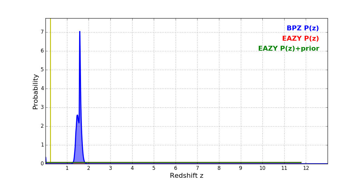 In P(z) plots: Yellow lines mark the cluster redshift z = 0.228,