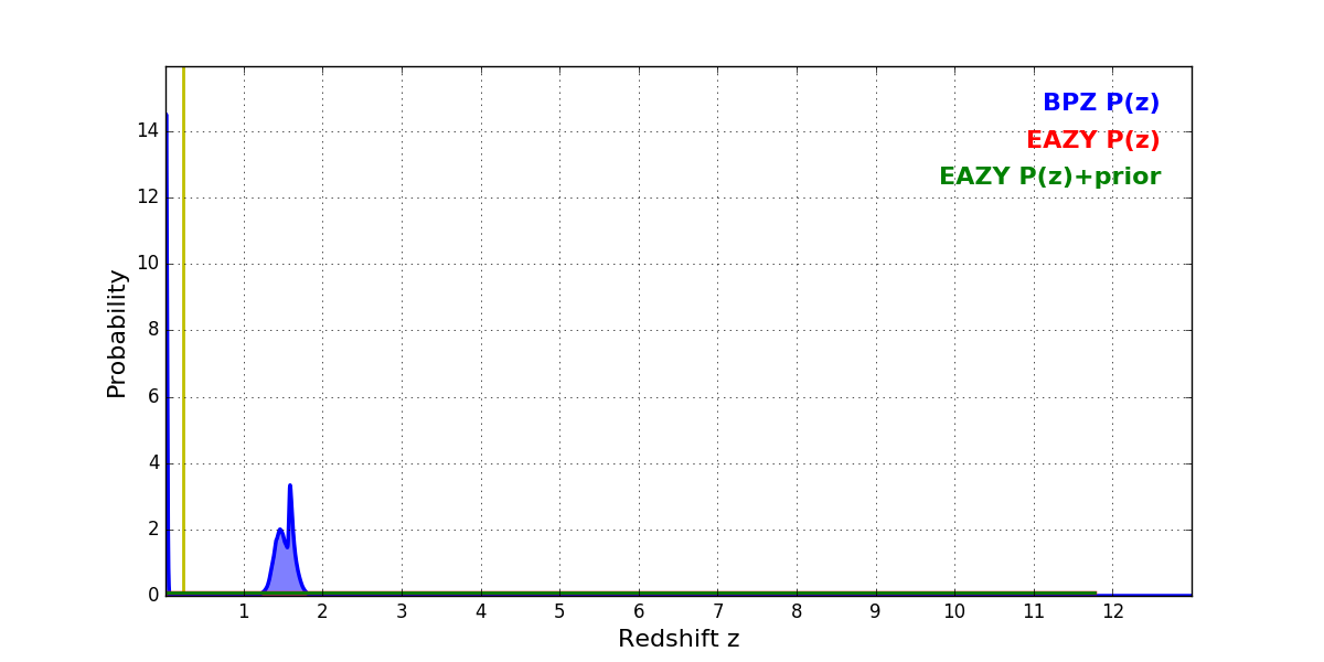 In P(z) plots: Yellow lines mark the cluster redshift z = 0.228,