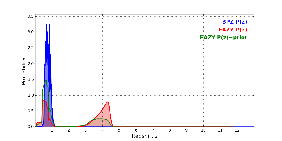 In P(z) plots: Yellow lines mark the cluster redshift z = 0.228,