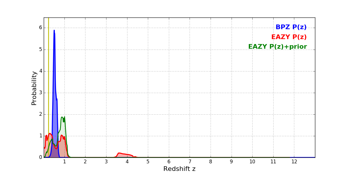 In P(z) plots: Yellow lines mark the cluster redshift z = 0.228,