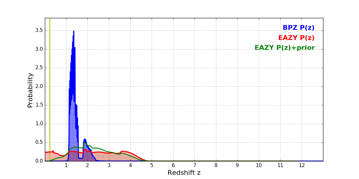 In P(z) plots: Yellow lines mark the cluster redshift z = 0.228,