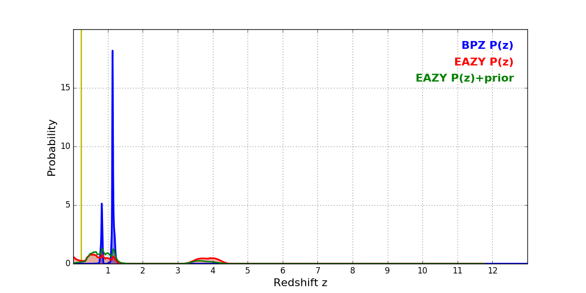 In P(z) plots: Yellow lines mark the cluster redshift z = 0.228,