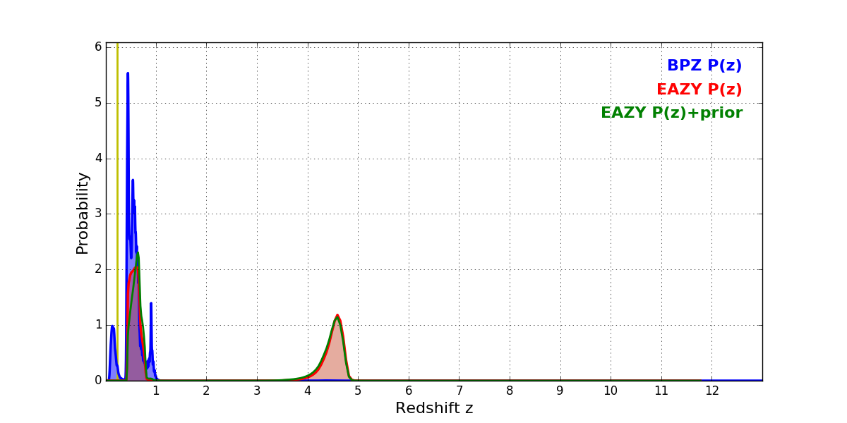 In P(z) plots: Yellow lines mark the cluster redshift z = 0.228,