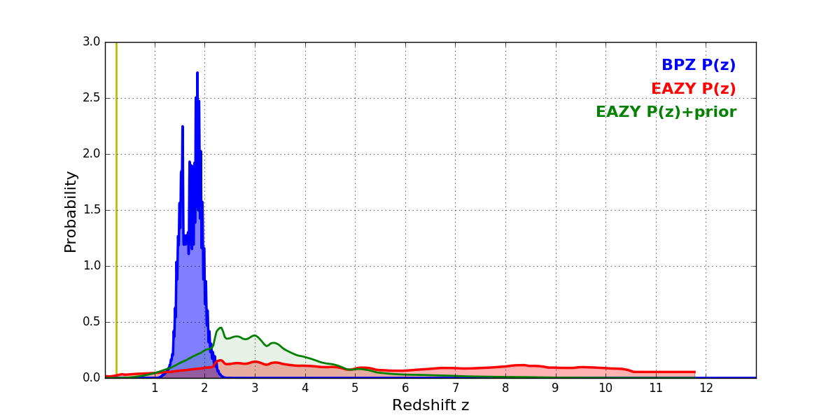 In P(z) plots: Yellow lines mark the cluster redshift z = 0.228,