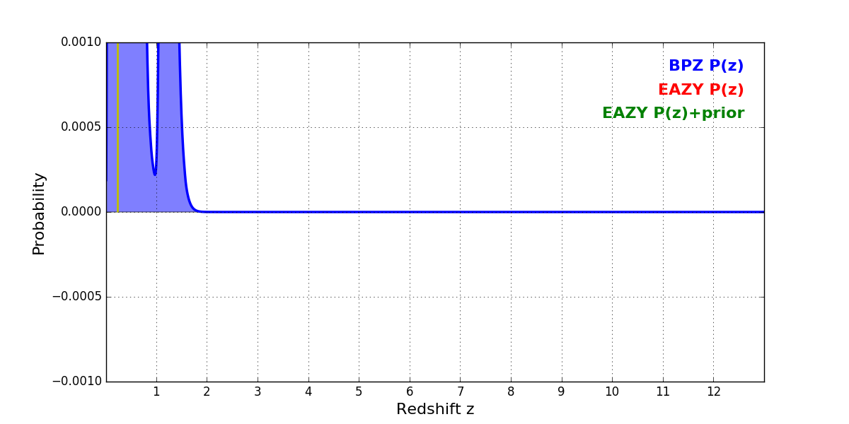 In P(z) plots: Yellow lines mark the cluster redshift z = 0.228,