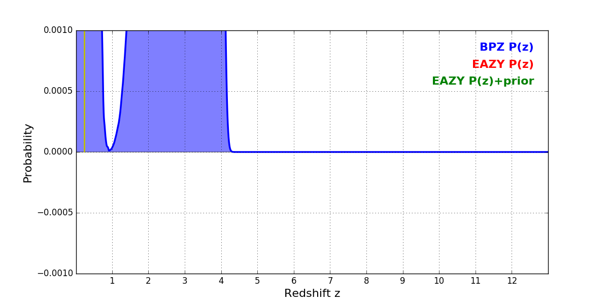 In P(z) plots: Yellow lines mark the cluster redshift z = 0.228,