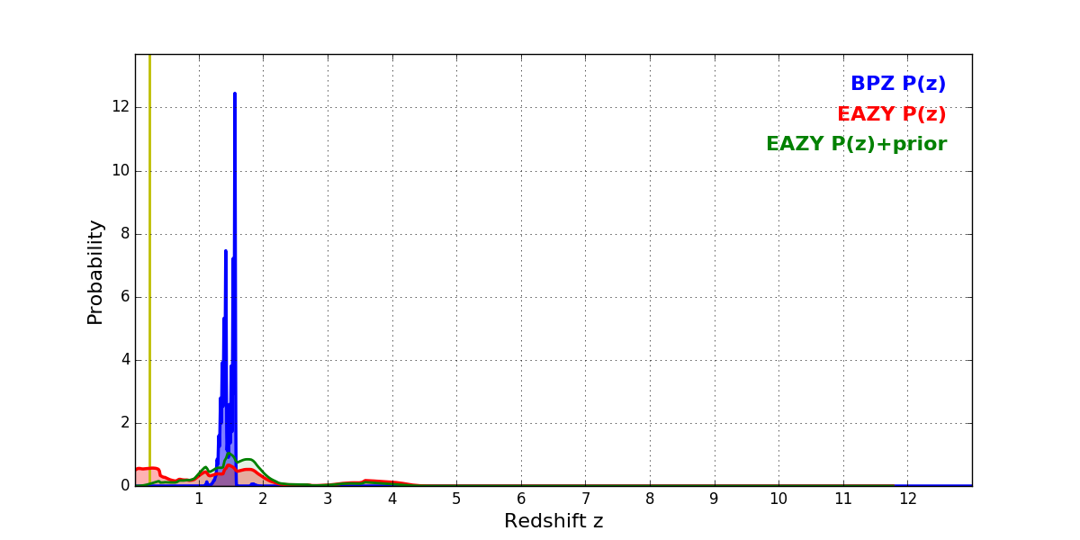 In P(z) plots: Yellow lines mark the cluster redshift z = 0.228,