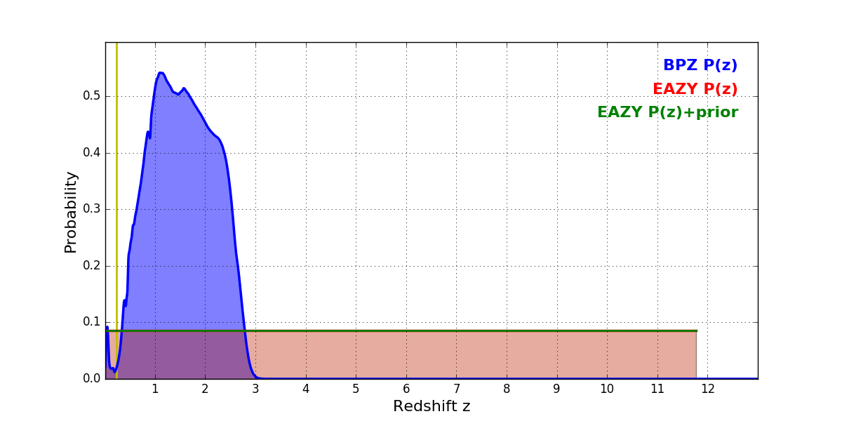In P(z) plots: Yellow lines mark the cluster redshift z = 0.228,