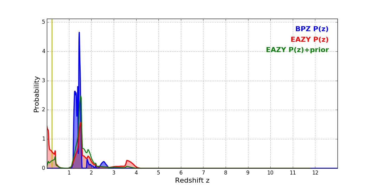 In P(z) plots: Yellow lines mark the cluster redshift z = 0.228,