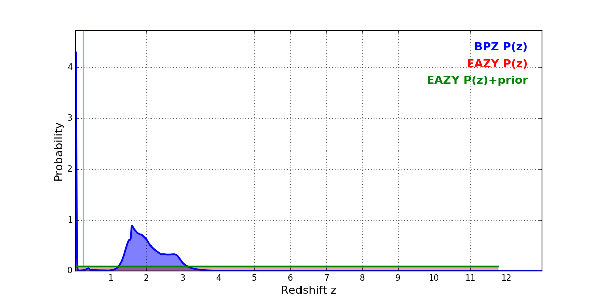 In P(z) plots: Yellow lines mark the cluster redshift z = 0.228,