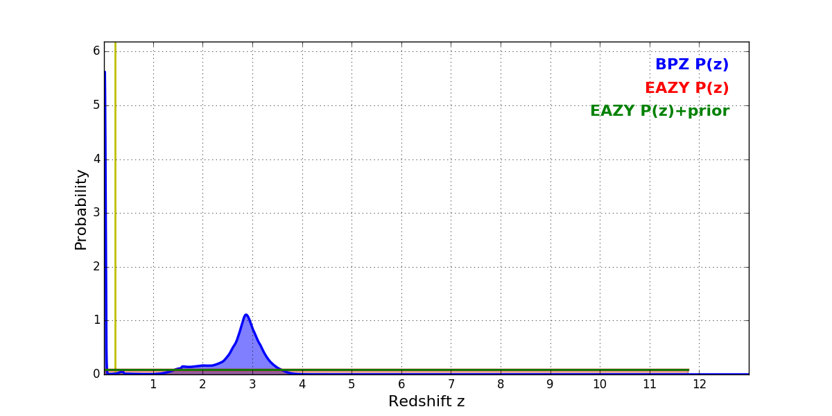 In P(z) plots: Yellow lines mark the cluster redshift z = 0.228,