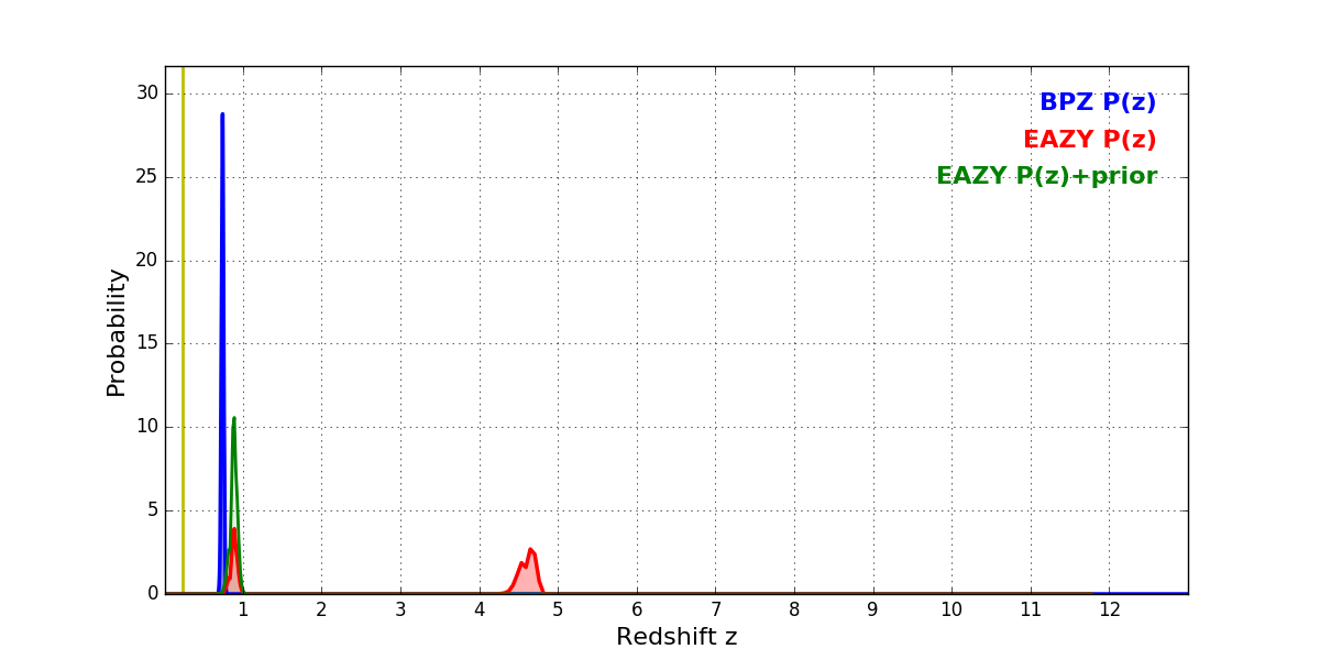 In P(z) plots: Yellow lines mark the cluster redshift z = 0.228,