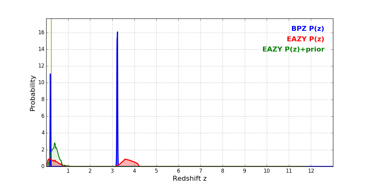In P(z) plots: Yellow lines mark the cluster redshift z = 0.228,