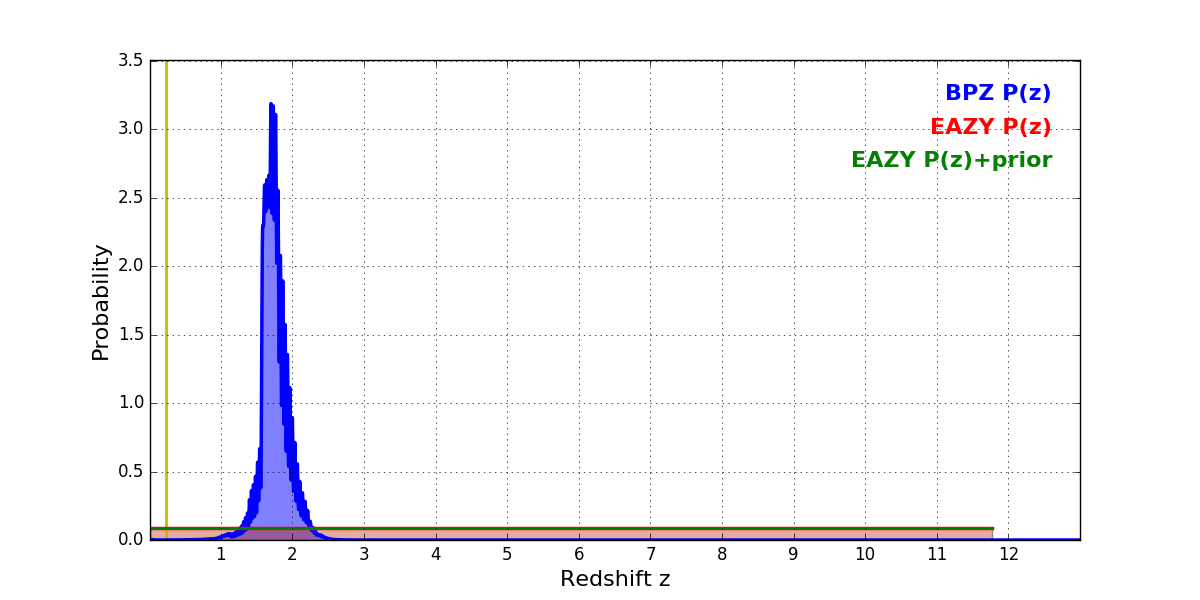 In P(z) plots: Yellow lines mark the cluster redshift z = 0.228,