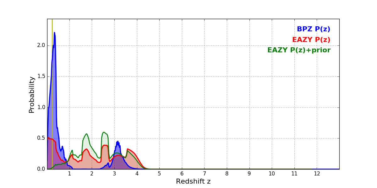 In P(z) plots: Yellow lines mark the cluster redshift z = 0.228,