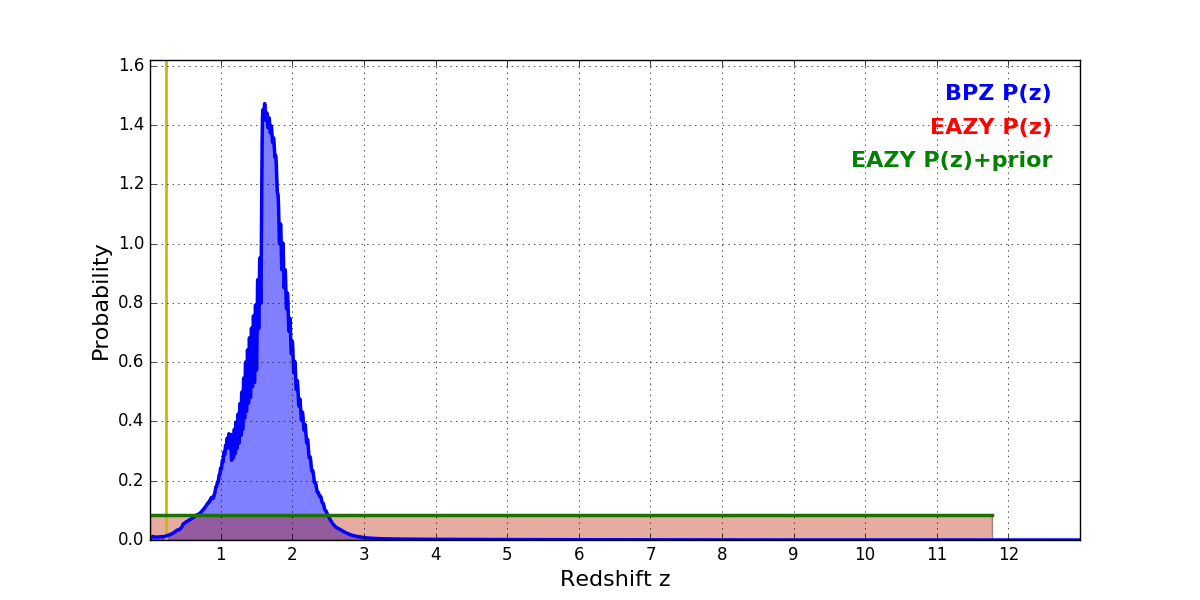 In P(z) plots: Yellow lines mark the cluster redshift z = 0.228,