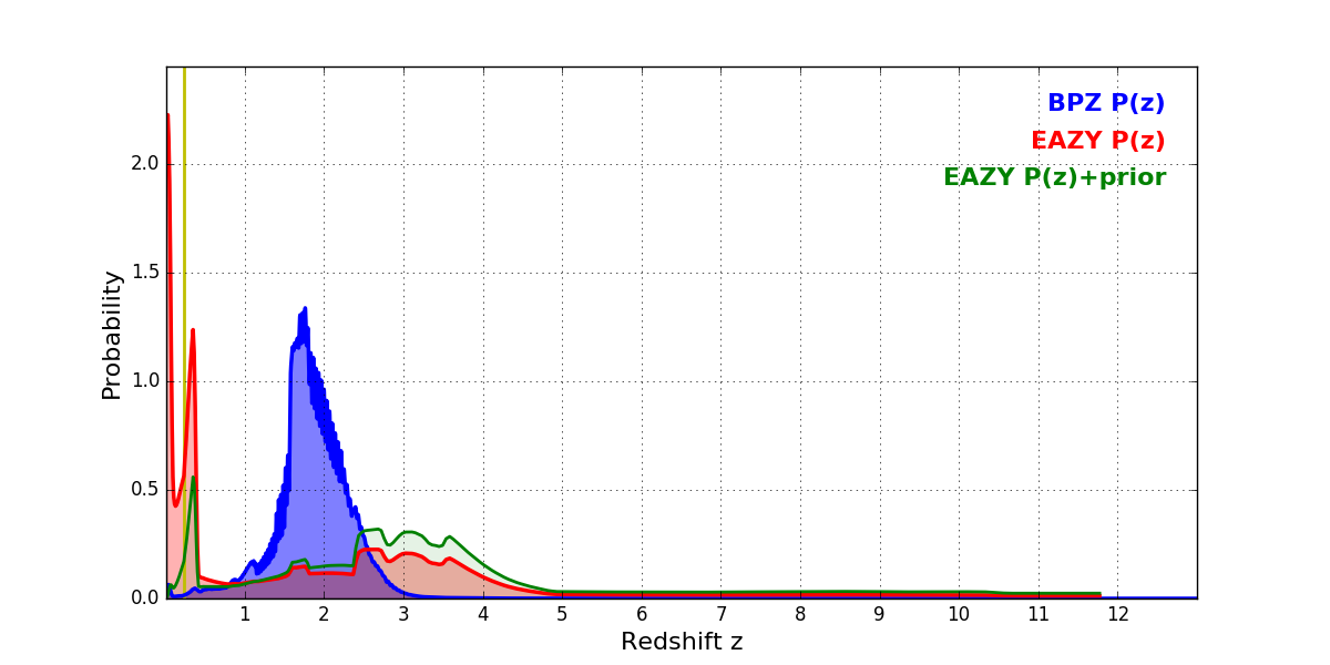 In P(z) plots: Yellow lines mark the cluster redshift z = 0.228,