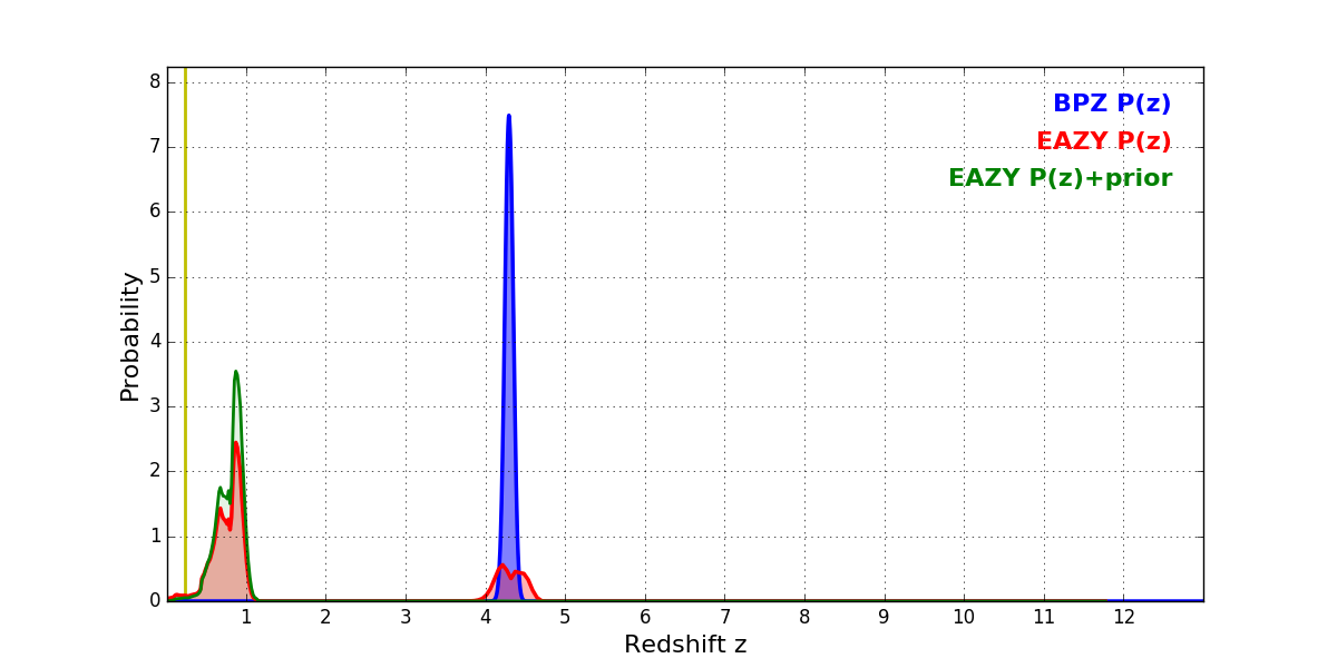 In P(z) plots: Yellow lines mark the cluster redshift z = 0.228,