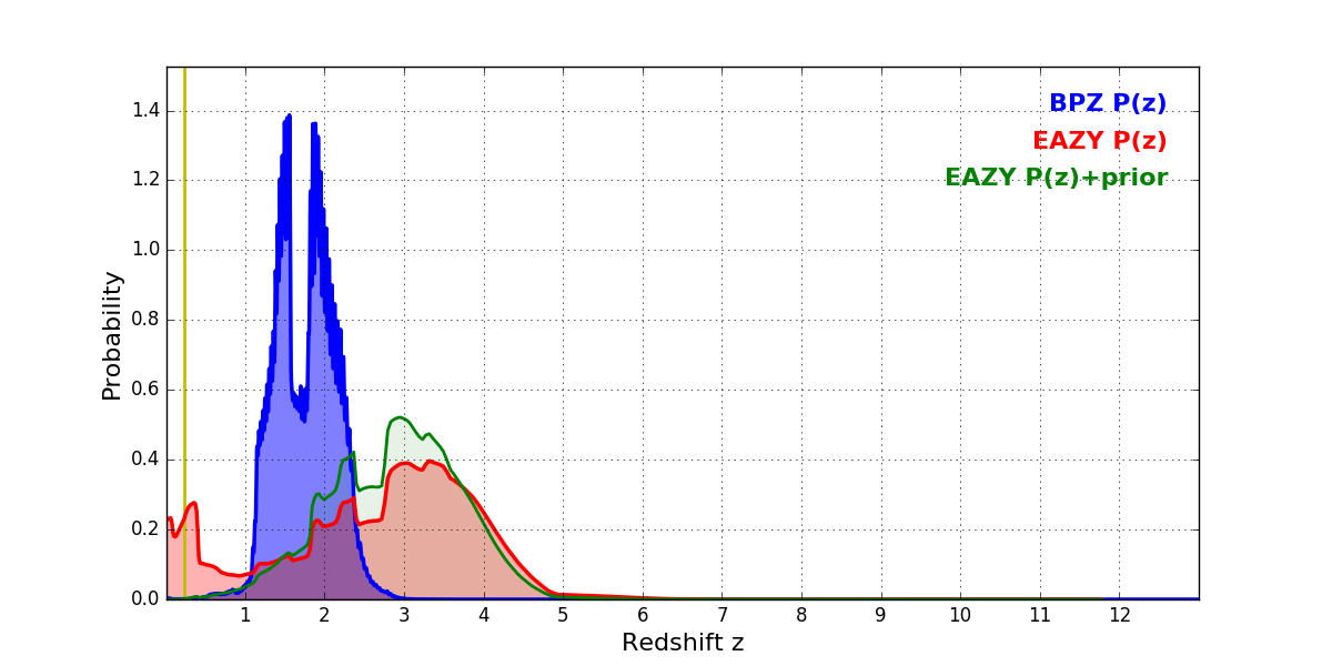In P(z) plots: Yellow lines mark the cluster redshift z = 0.228,
