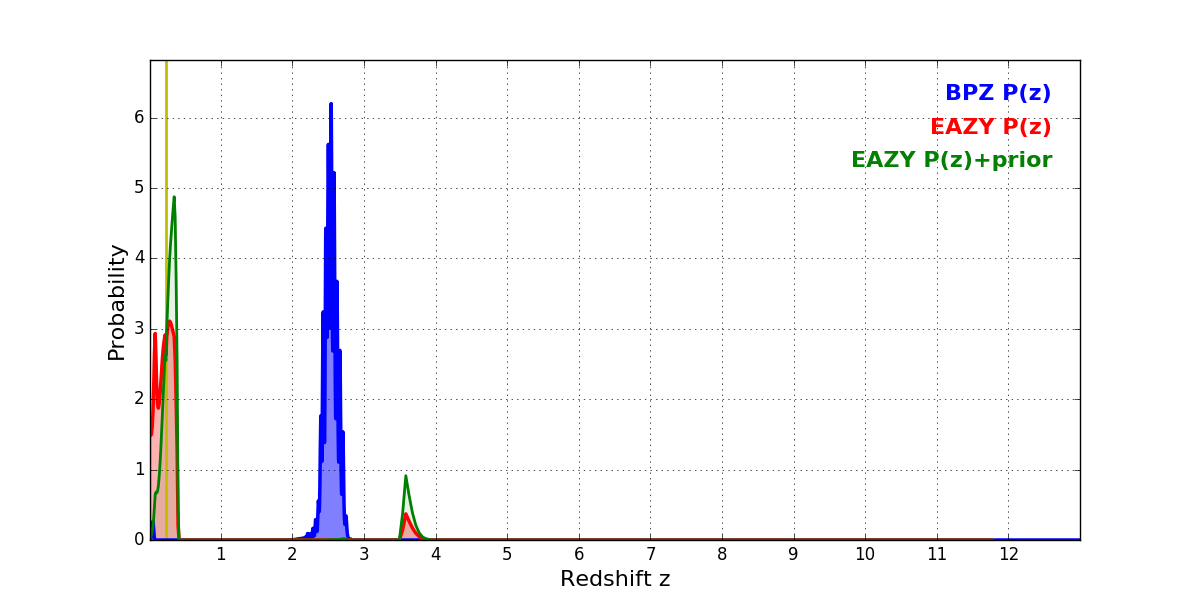 In P(z) plots: Yellow lines mark the cluster redshift z = 0.228,