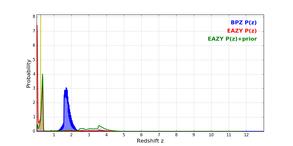 In P(z) plots: Yellow lines mark the cluster redshift z = 0.228,