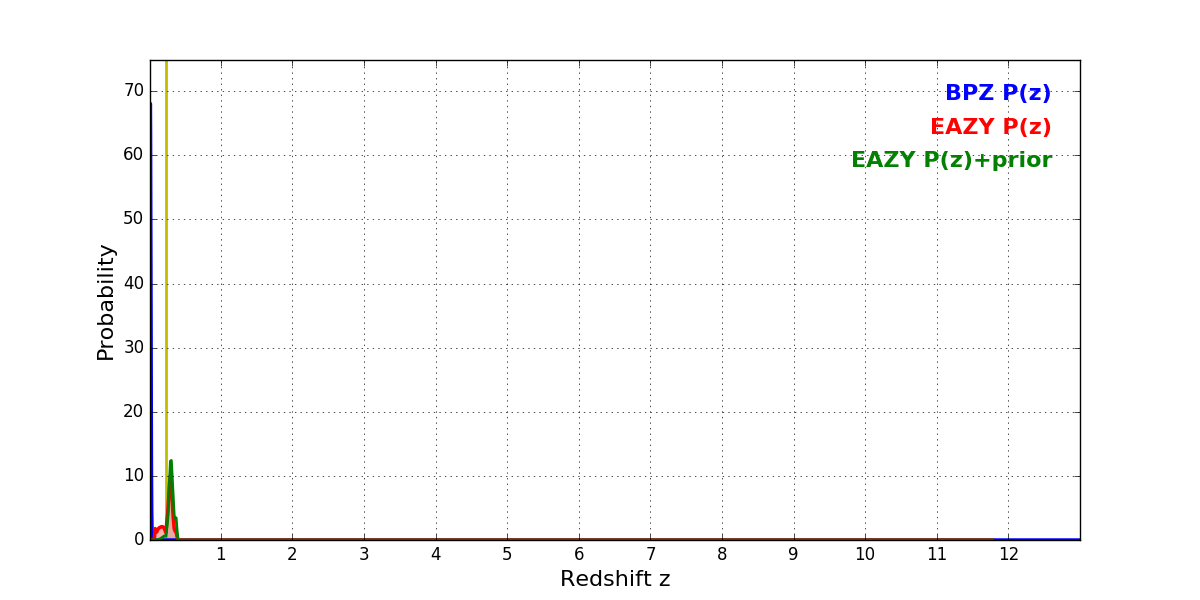 In P(z) plots: Yellow lines mark the cluster redshift z = 0.228,
