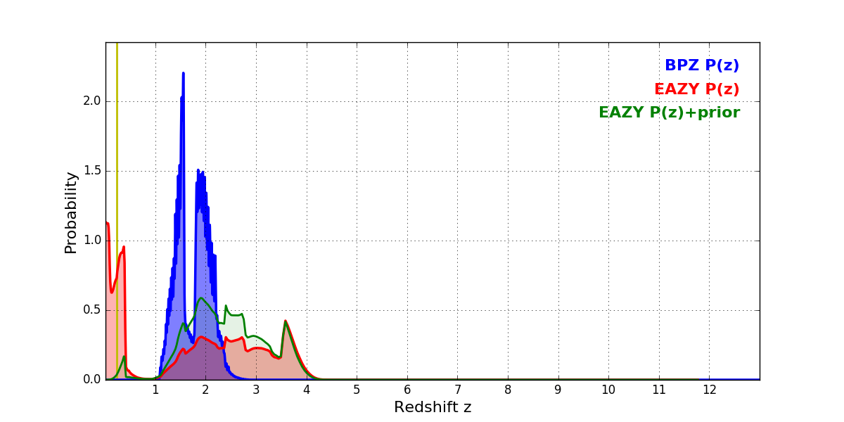 In P(z) plots: Yellow lines mark the cluster redshift z = 0.228,