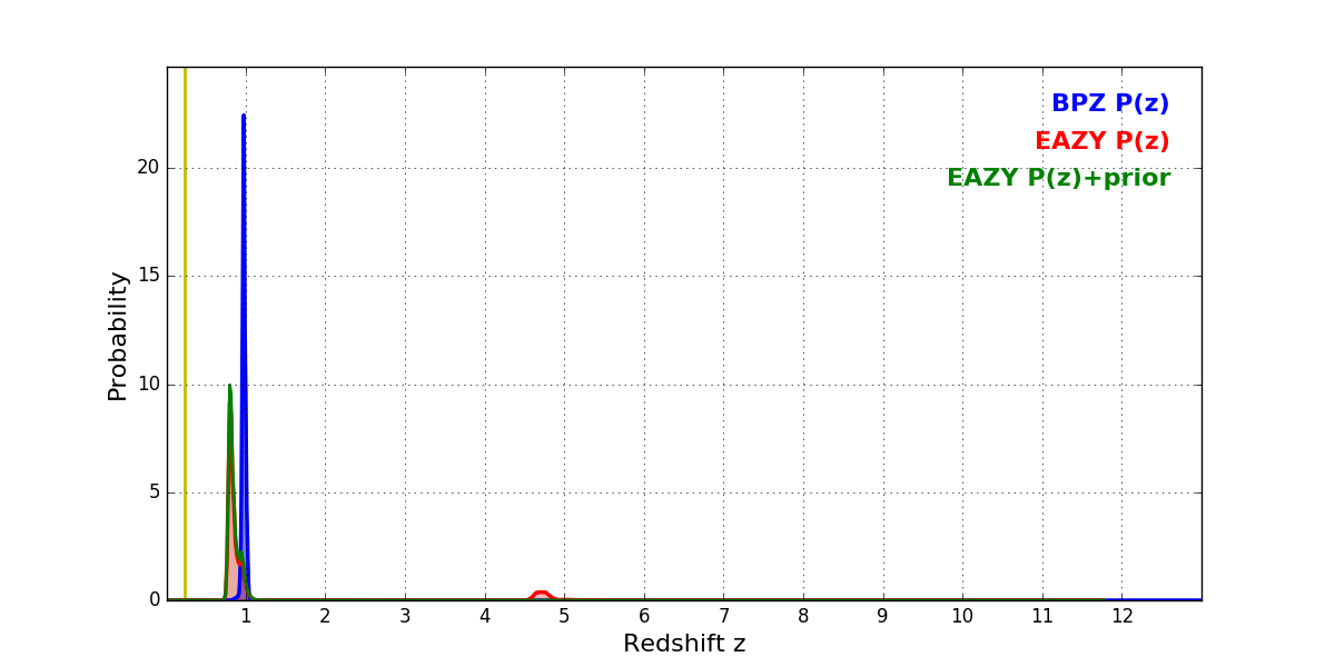 In P(z) plots: Yellow lines mark the cluster redshift z = 0.228,