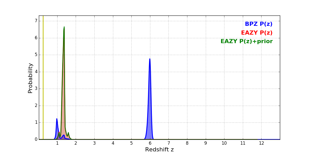 In P(z) plots: Yellow lines mark the cluster redshift z = 0.228,