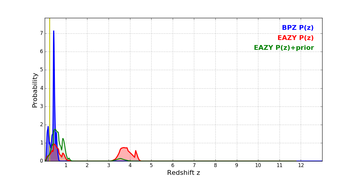In P(z) plots: Yellow lines mark the cluster redshift z = 0.228,