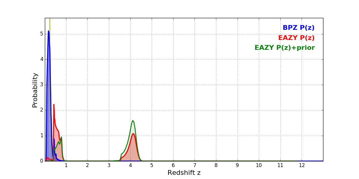 In P(z) plots: Yellow lines mark the cluster redshift z = 0.228,