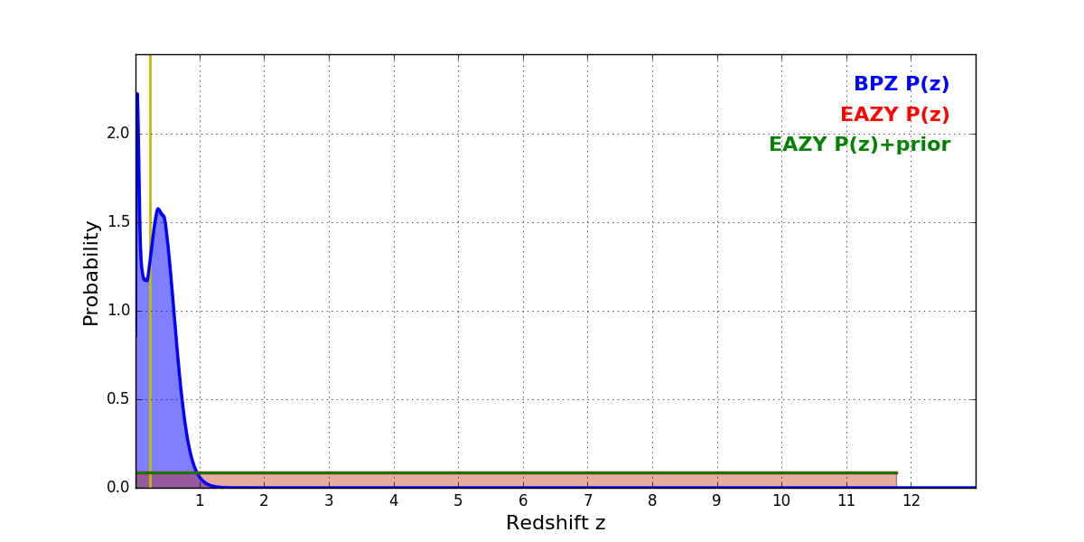 In P(z) plots: Yellow lines mark the cluster redshift z = 0.228,