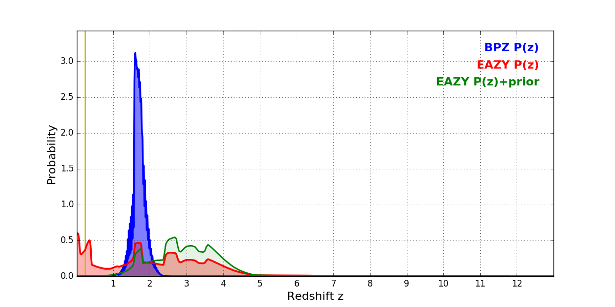 In P(z) plots: Yellow lines mark the cluster redshift z = 0.228,