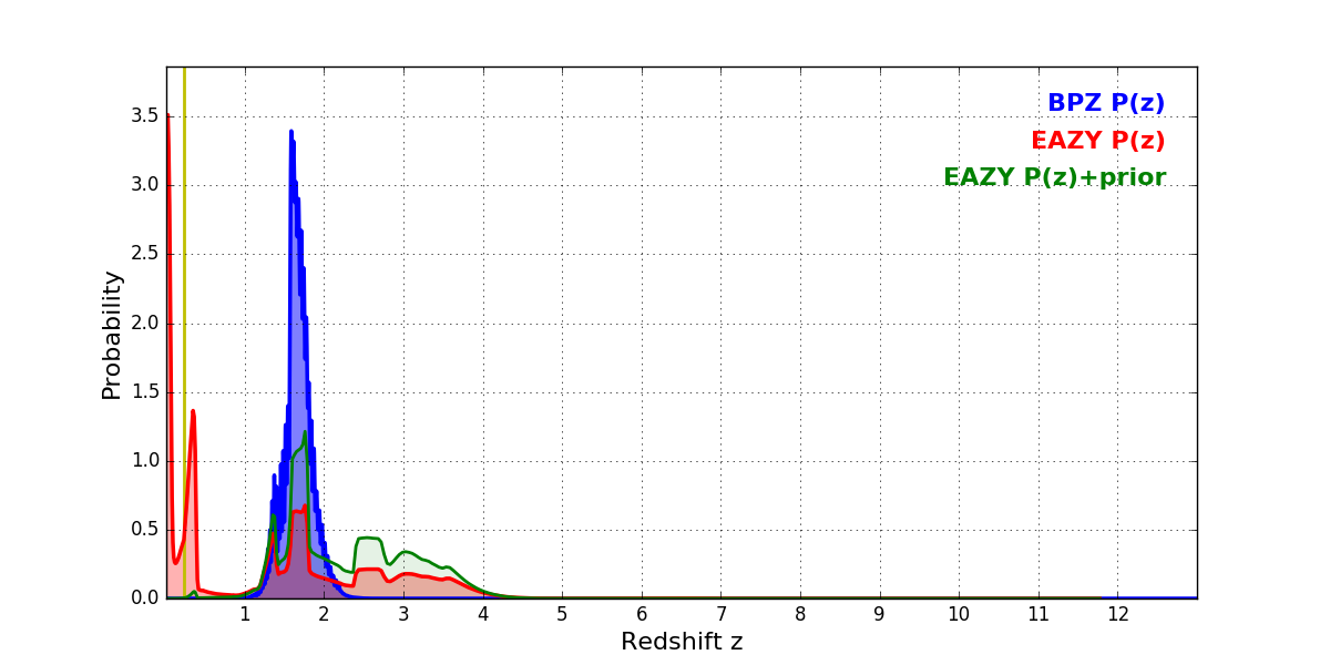 In P(z) plots: Yellow lines mark the cluster redshift z = 0.228,