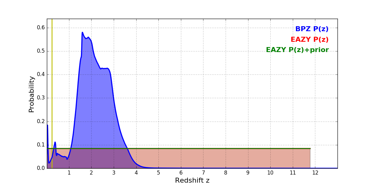 In P(z) plots: Yellow lines mark the cluster redshift z = 0.228,