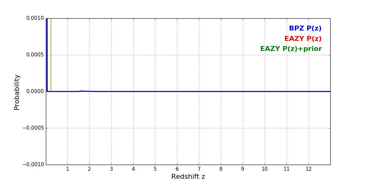 In P(z) plots: Yellow lines mark the cluster redshift z = 0.228,