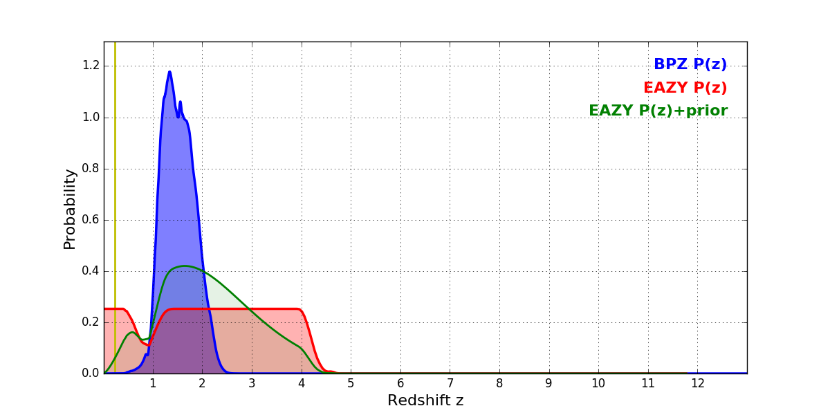 In P(z) plots: Yellow lines mark the cluster redshift z = 0.228,