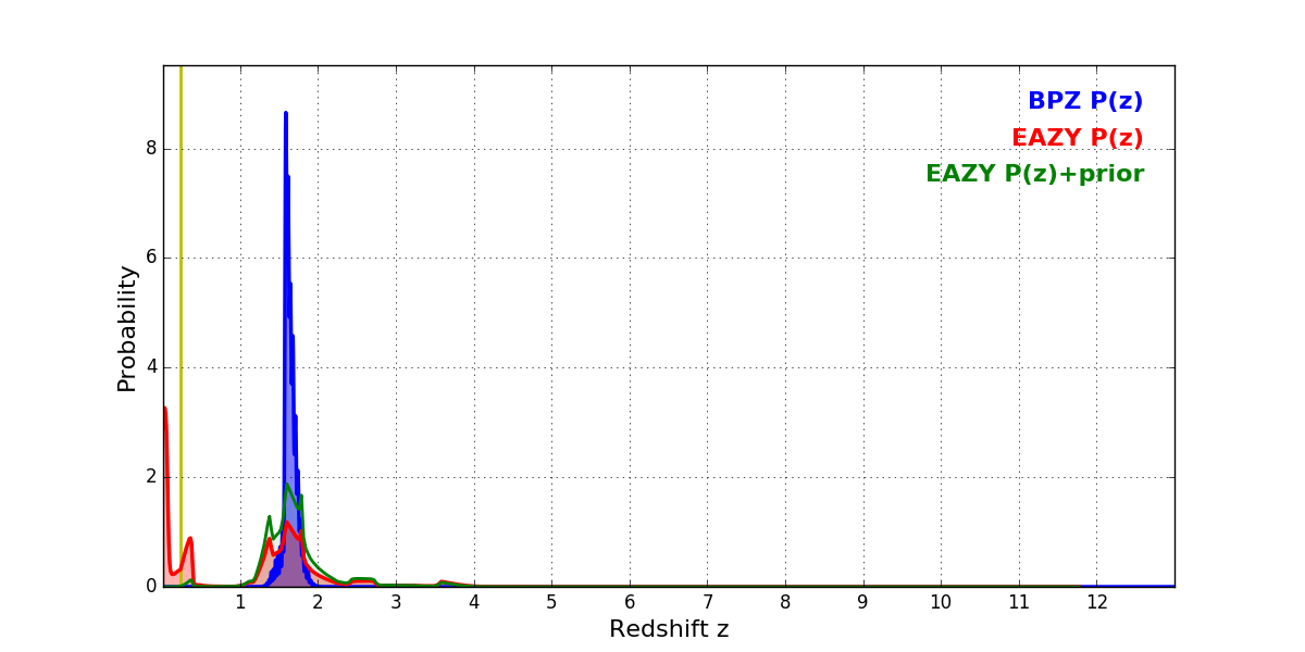In P(z) plots: Yellow lines mark the cluster redshift z = 0.228,