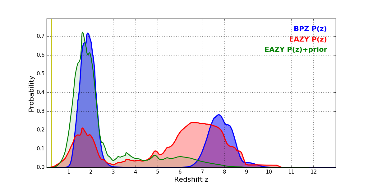 In P(z) plots: Yellow lines mark the cluster redshift z = 0.228,