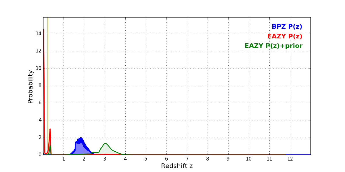 In P(z) plots: Yellow lines mark the cluster redshift z = 0.228,