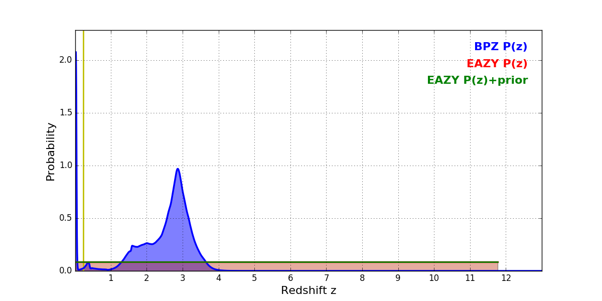 In P(z) plots: Yellow lines mark the cluster redshift z = 0.228,