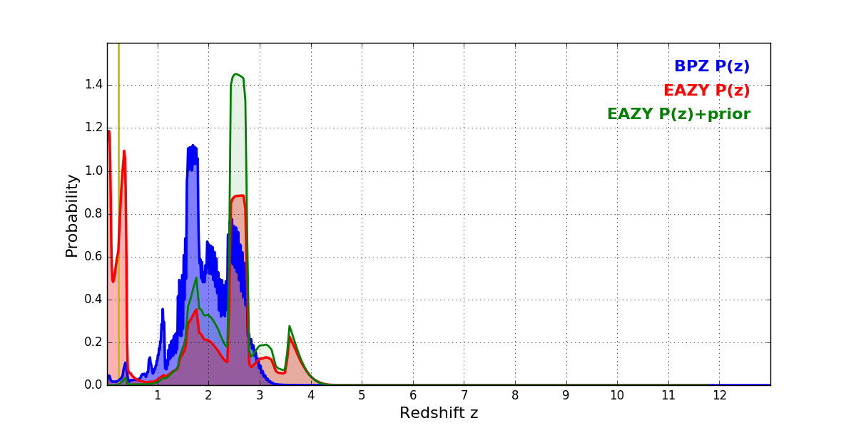 In P(z) plots: Yellow lines mark the cluster redshift z = 0.228,