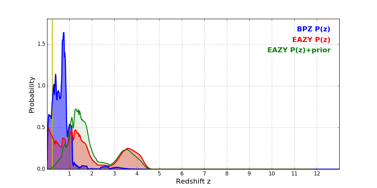 In P(z) plots: Yellow lines mark the cluster redshift z = 0.228,