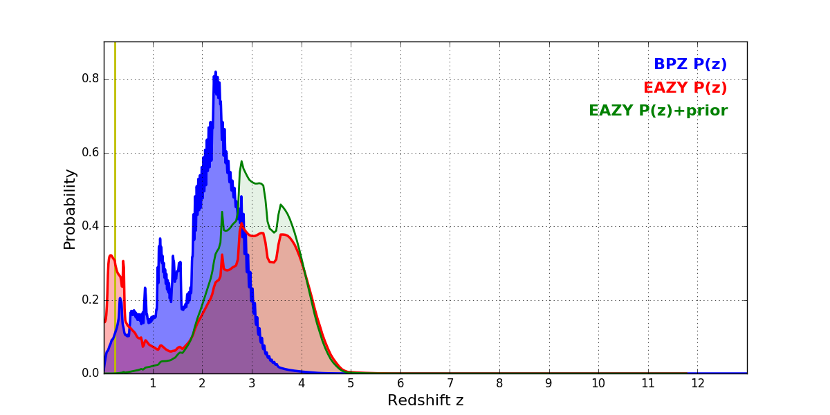 In P(z) plots: Yellow lines mark the cluster redshift z = 0.228,