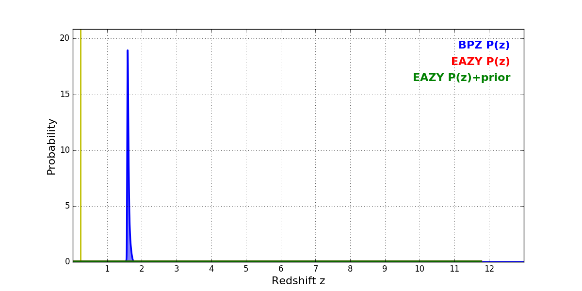 In P(z) plots: Yellow lines mark the cluster redshift z = 0.228,