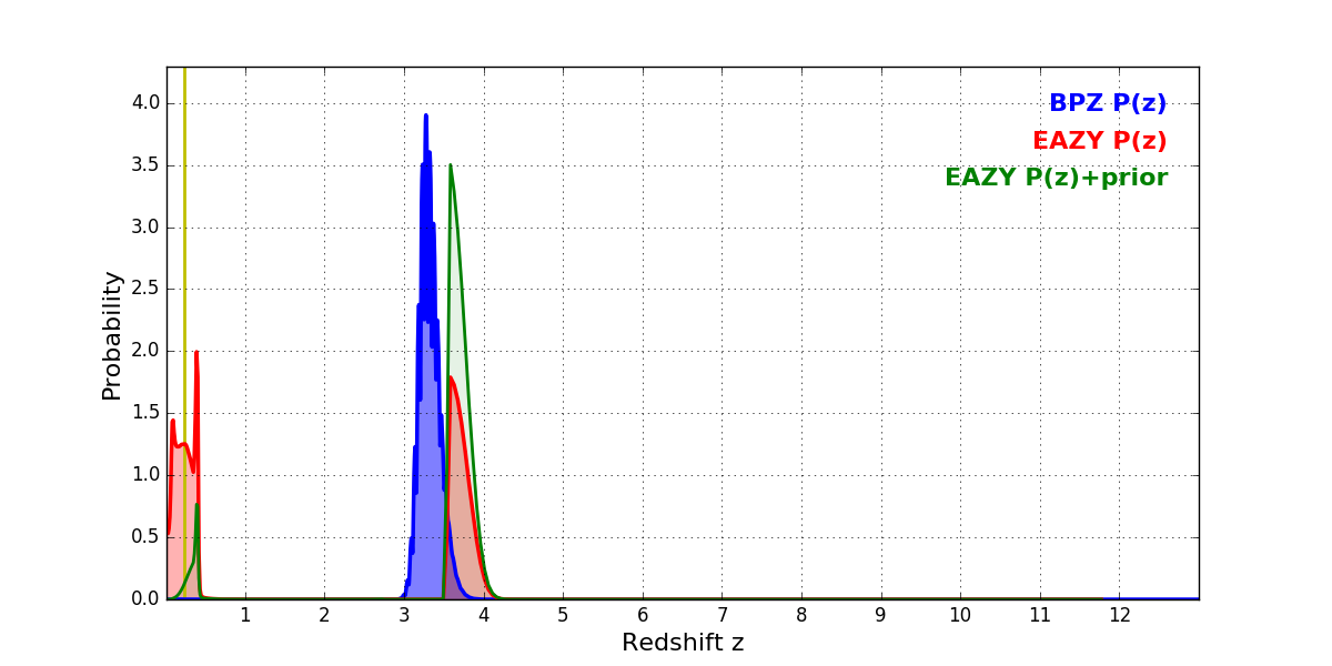 In P(z) plots: Yellow lines mark the cluster redshift z = 0.228,