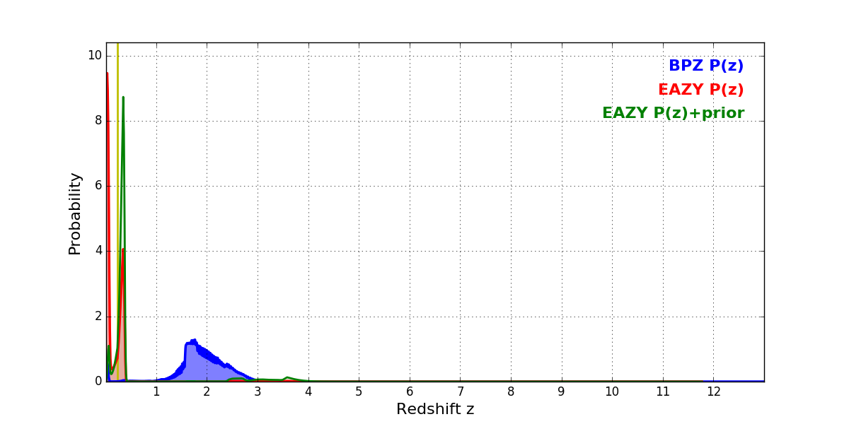 In P(z) plots: Yellow lines mark the cluster redshift z = 0.228,